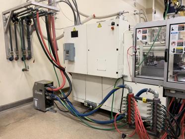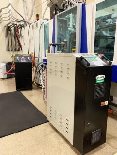 In order to achieve optimum mold temperature – which may be above the chilled water supply temperature – we use thermolators, which can raise the water temperature in a small closed loop system that pumps it through the tooling. Using these, we can run different temperatures at each machine location. Each thermolator has a separate valve to let in a little chilled water and release some of the hot water to maintain a stable temperature.
